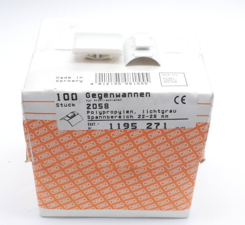 100 Stück OBO Bettermann Gegenwannen 2058 Spannbereich 22-28mm Zustand: Neu und OVP Wir versenden Weltweit ! Bitte kontaktieren Sie uns für Details. We are shipping worldwide, please contact us by ebay system. |