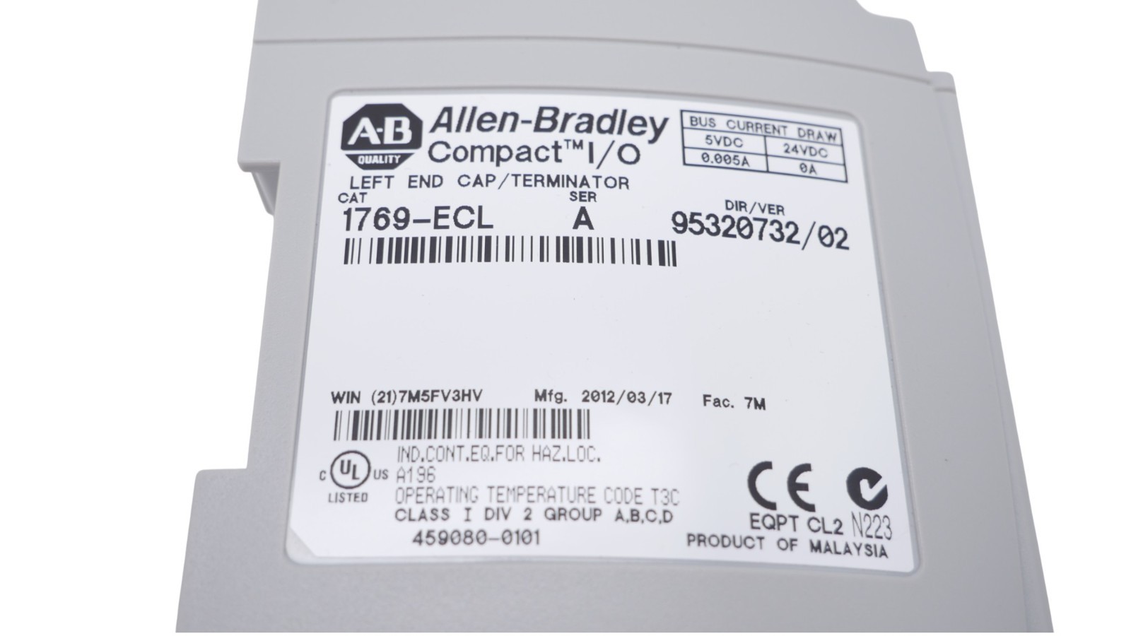 Allen-Bradley 1769-ECL Endkappe Terminator PLC-Modul Serie A DIR/VER 95320732/02 Zustand: aus Lagerauflösung – Artikel kann Lagerspuren aufweisen Wir versenden Weltweit ! Bitte kontaktieren Sie uns für Details. We are shipping worldwide, please contact us by ebay system.