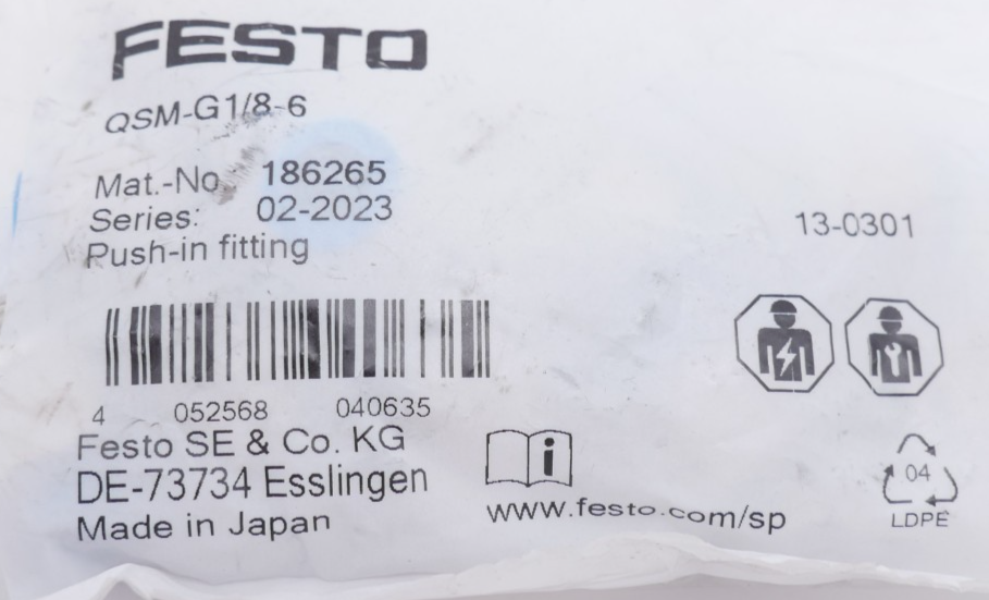 Festo QSM-G1/8-6 Steckverschraubung 186265 Außengewinde G1/8 0,95-14bar 2,8mm Ø6mm VPE 10 Stück Zustand: Neu und OVP Wir versenden Weltweit ! Bitte kontaktieren Sie uns für Details. We are shipping worldwide, please contact us by ebay system. |