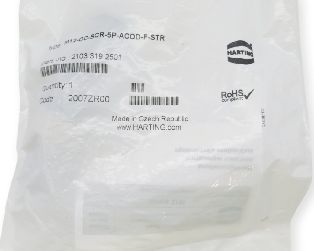 Harting M12-CC-SCR-5P-ACOD-F-STR Rundsteckverbinder 21033192501 Zustand: Neu und OVP Wir versenden Weltweit ! Bitte kontaktieren Sie uns für Details. We are shipping worldwide, please contact us by ebay system. |