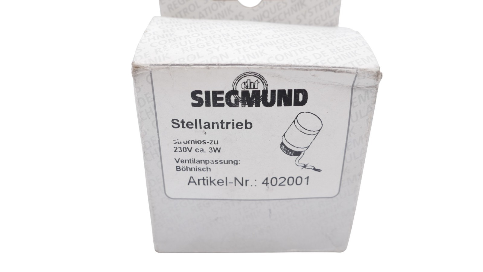 Siegmund 402001 Stellantrieb stromlos zu 230V ca. 3W Ventilanpassung Böhnisch Zustand: Neu und OVP Wir versenden Weltweit ! Bitte kontaktieren Sie uns für Details. We are shipping worldwide, please contact us by ebay system. |