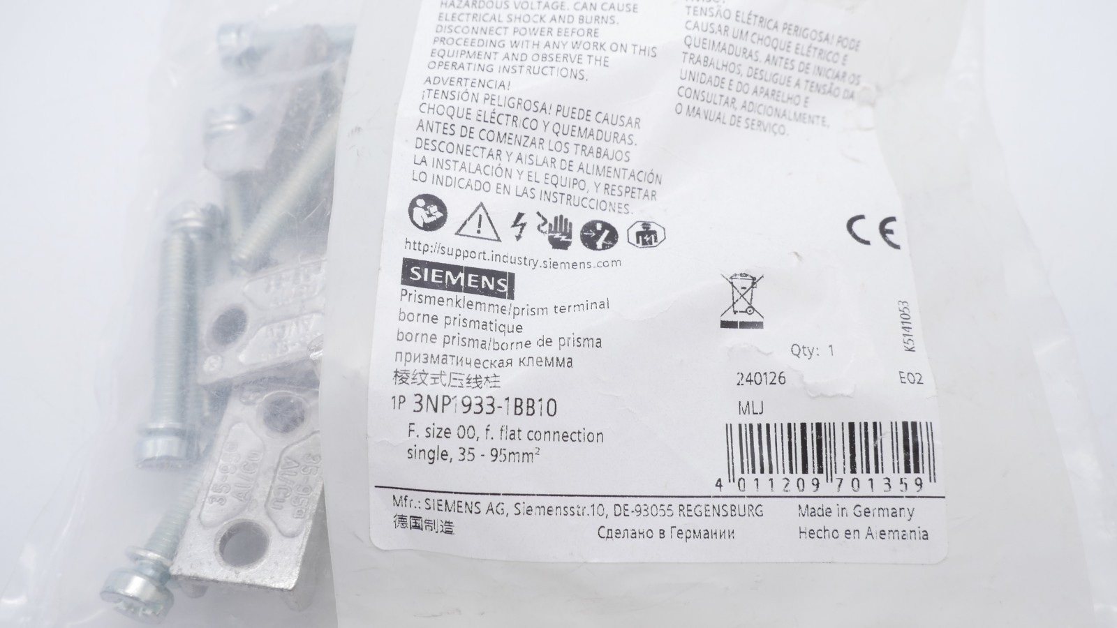 Siemens 3NP1933-1BB10 Prismenklemme 35-95mm² Zustand: Neu und OVP Wir versenden Weltweit ! Bitte kontaktieren Sie uns für Details. We are shipping worldwide, please contact us by ebay system. |